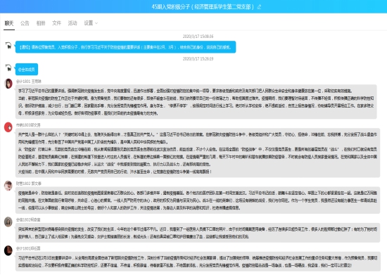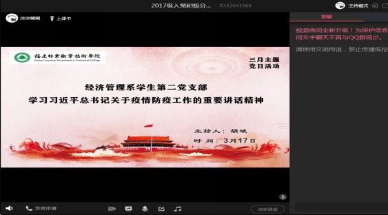 3月17日下午,经济管理系学生第二党支部(原学生第三党支部)召开了一场特别的主题党日活动。在疫情防控工作关键时期,经济管理系学生第二党支部坚持疫情防控不放松,党员学习不间断,结合支部实际,依托支部党员QQ群、群课堂直播开展“线上主题党日活动”,确保党员教育活动不断档、常态化。