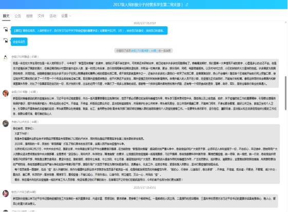 在交流环节,学生党员、入党积极分子就学习习近平总书记关于疫情防疫工作的重要讲话精神,结合自己实际情况先后进行分享。