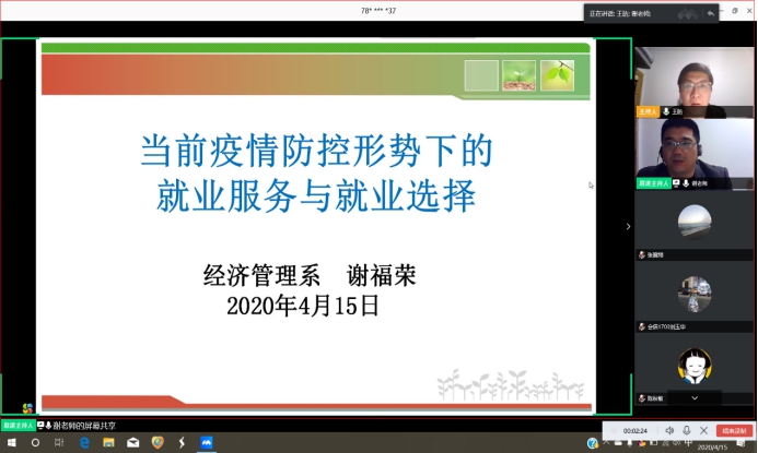 为及时掌握毕业班就业状况和思想心理状况,有针对性地开展就业推荐和教育引导工作,2020年4月15日晚,经济管理系组织召开2020届毕业生就业服务与就业选择讲座暨就业指导工作网络视频会议,会议由学生科科长王昉主持,系党总支书记谢福荣作“当前疫情防控形势下的就业服务与就业选择”主题讲座,毕业班辅导员和全体毕业生在线参加。