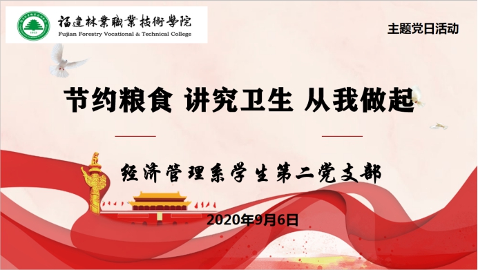 为深入贯彻落实习近平总书记对制止餐饮浪费行为的重要指示精神,以及进一步加强我系防疫期间爱国卫生运动工作,切实提高校园环境卫生,引导师生牢固树立“节约光荣、浪费可耻”、“以卫生为光荣,以不卫生为耻辱”的意识,养成节俭节约、讲究卫生,人人有责、人人受益的良好行为习惯。为此,2020年9月6日经济管理系学生第二党支部,在天麟校区礼堂开展“节约粮食 讲究卫生 从我做起”主题党日活动。支部教师党员胡斌老师、王昉老师以及部分返校学生党员参加此次主题党日活动。