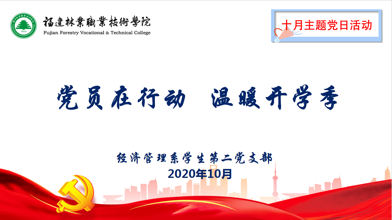 为彰显新时代的党员服务意识,发挥党员的先锋模范作用,充分展现新时代大学生的精神风貌。也为进一步弘扬“敬业、吃苦、务实、进取”的天麟精神,切实让2020级学生感受到党和学院的温暖。在10月10日至10月11日2020级新生报到以及入学教育过程中,经济管理系学生第二党支部组织开展主题为“党员在行动 温暖开学季”的党日活动。参加此次主题党日活动的成员主要有支部教师党员胡斌老师、王昉老师、严艳老师以及在校学生党员、入党积极分等。