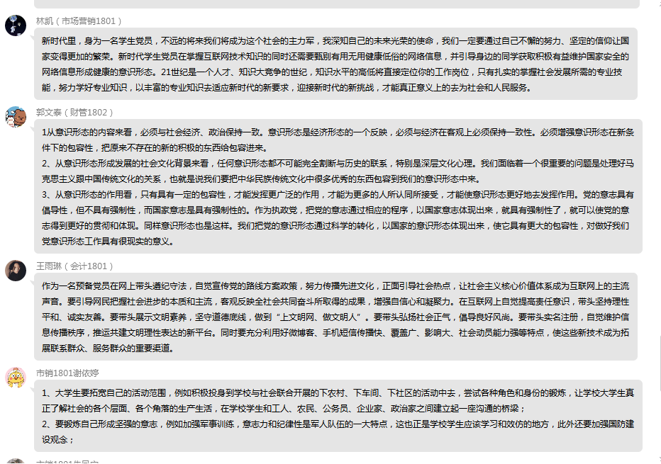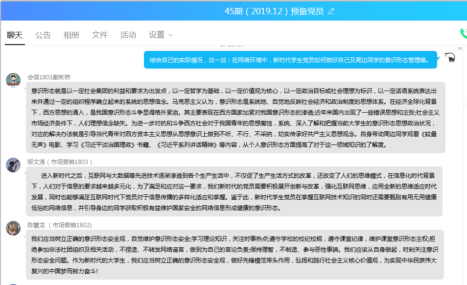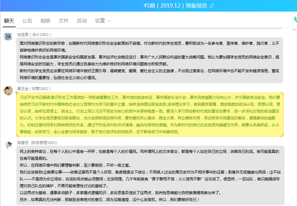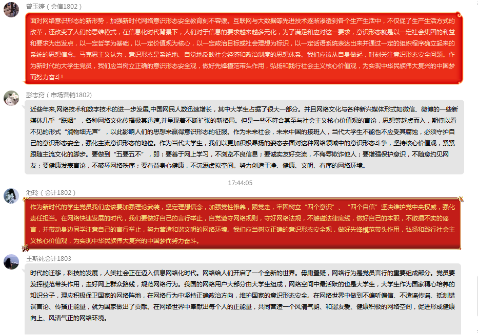 在教育活动结束之后,支部学生党员、入党积极分子围绕《坚持党对国家安全工作的绝对领导》、《坚持底线思维,着力防范化解重大风险》、《“习书记常说‘共产党的基本功就是联系群众’”》提交一份学习心得并在支部QQ群就“在网络环境中,新时代学生党员如何做好自己及周边同学的意识形态管理”进行热烈谈论。