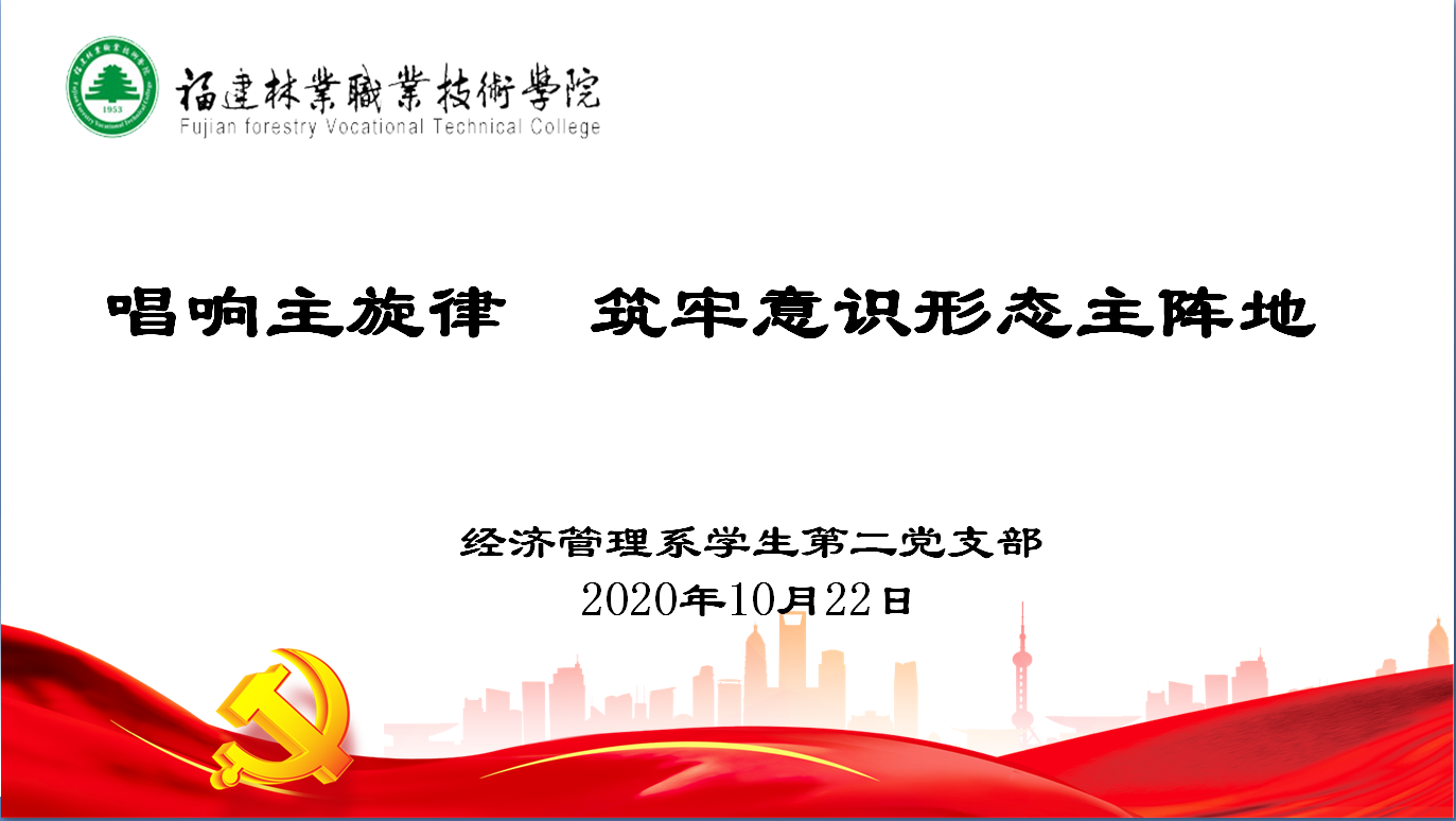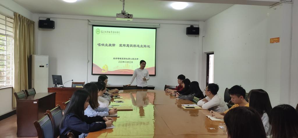习近平总书记在全国宣传思想工作会议上指出:“宣传思想工作就是要巩固马克思主义在意识形态领域的指导地位,巩固全党全国人民团结奋斗的共同思想基础。”意识形态工作关乎党的前途命运、国家长治久安和人心向背,是党和国家的精神支柱和灵魂。一个国家的主流意识是人民选择的结果,也是历史逻辑演绎的结果。为此,2020年10月22日下午,经济管理系学生第二党支部在经管楼408会议室组织开展“唱响主旋律 筑牢意识形态主阵地”为主题的教育活动。教育活动有支部书记胡斌老师主持,支部教师党员、在校学生党员参加现场活动。