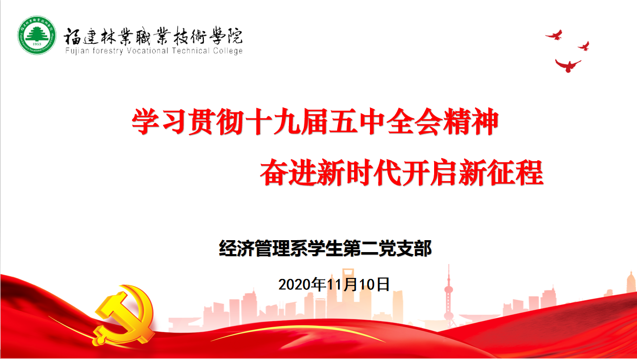 高瞻远瞩绘就宏伟蓝图,砥砺奋进谱写发展新篇。十九届五中全会充分肯定“十三五”时期我国经济社会发展取得的巨大成就,科学擘画中国未来5年以及15年的发展新蓝图。2020年11月10日,经济管理系学生第二党支部在经管楼408会议室开展“学习贯彻十九届五中全会精神 奋进新时代开启新征程”为主题的教育活动。