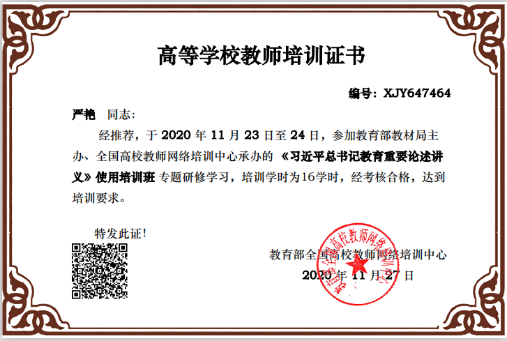 此外,为深刻领会、准确把握习近平总书记关于教育的重要论述,进一步推进习近平新时代中国特色社会主义思想“三进”,2020年11月23日至24日,支部教师党员一同参加教育部教材局组织的《习近平总书记教育重要论述讲议》使用网络培训班并顺利通过考核。