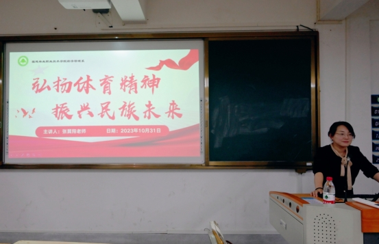 体育强则国强,国运兴则体育兴。为贯彻习近平总书记提出的体育强国建设,经济管理系经济管理系学生第一党支部于2023年10月31日在科教楼402组织开展了以“弘扬体育精神,振兴民族未来”为主题的党课,本次党课由教师党员张翼翔老师讲授,党支部党员、预备党员、入党积极分子。