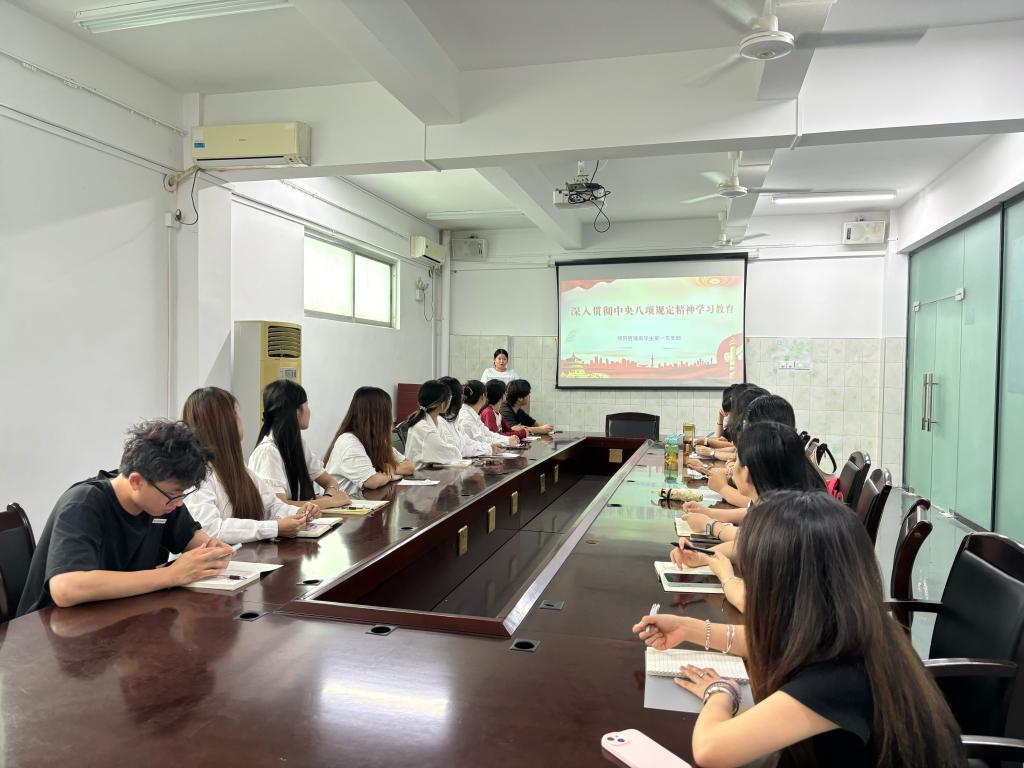 为深入贯彻中央八项规定精神,持续加强支部党员纪律意识,扎实推进作风建设。2025年5月20日,经济管理系学生第一党支部于“一站式”学生社区会议室开展主题为“深入贯彻中央八项规定精神学习教育”专题党课学习。本次专题党课由经济管理系学生第一党支部书记卢彦铭主持,支部党员教师、学生预备党员参加。