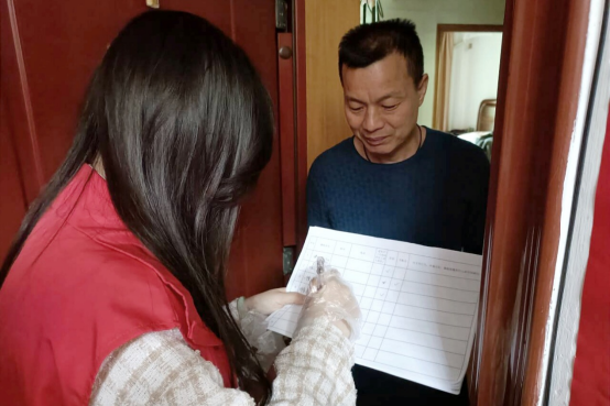 志愿者咨询居民意见,仔细填写调查表格