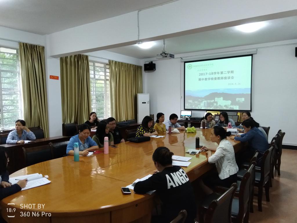 4月26日下午,经济管理系在系会议室召开了2017-2018学年第二学期期中教学检查教师座谈会。经管系主任蔡敏、各教研室主任、经管系全体教师及辅导员参加会议。