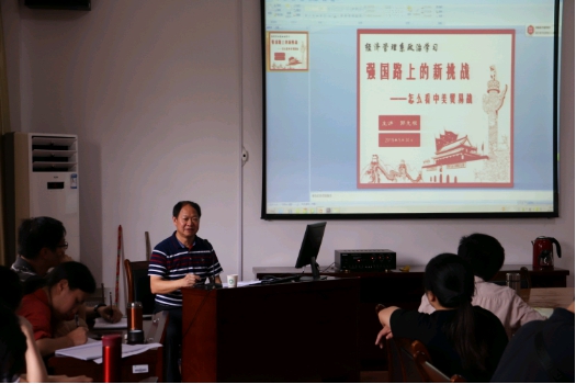 为弘扬爱国主义精神,引导全体党员正确认识中美贸易战,2019年5月30日下午,经济管理系党总支诚邀院党工部部长郭先根为全系师生作《强国路上的新挑战——怎么看中美贸易战?》专题讲座。经济管理系全体教职工、师生党员参加会议。会议由经济管理系党总支书记谢福荣主持。