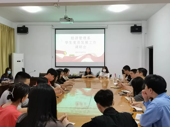为近一步做好入党积极分子入党情况跟踪调查,加强学生党员相关管理工作,加强经济管理系学生思想政治教育及良好意识形态的形成。会上,谢福荣书记简述近期学校党建设工作和党员发展的现状后,请参会同学按序依次发表自己的观点,同学纷纷提出对学院党组织的工作建议,如开展多形式的志愿活动、宣传党的革命精神与先进文化、加强红色教育和党的理论知识学习、扎实理论基础、提高党性修养等。最后,谢福荣书记对此次会议进行总结发言,他对学生党员们的发言一一进行评价回复,并对此会议进行总结和对学生党员提出要求:表示在往后的工作会将理论和形式多样化的线下活动相结合,加大宣传力度,在高标准、严要求下培育出更加优秀的党员团队;同时也要求学生党员进一步发扬在学习上、作风上的优良做法,做好先锋模范榜样作用,从而在班风学风建设上产生良好影响。