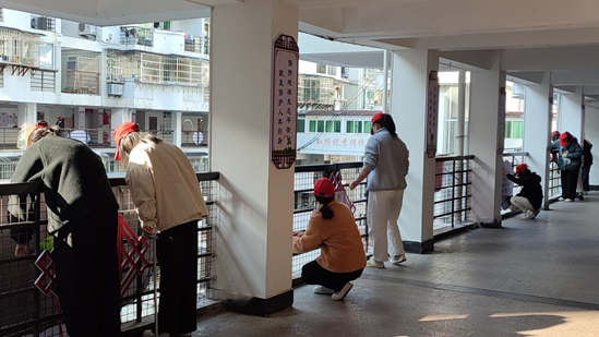 志愿者们身着红色马甲,对社区的文化长廊地板以及边角垃圾进行清扫,同时对天花板的蜘蛛网清扫了一番,擦拭了周围的门窗栏杆。旁边不时有居民从旁边路过,对我系志愿者给予了肯定的目光,表示对志愿者工作的肯定和鼓励。