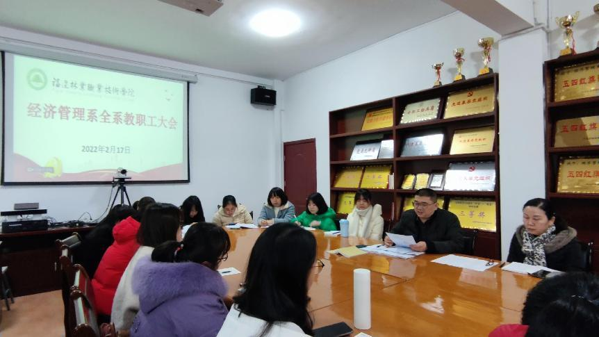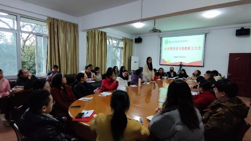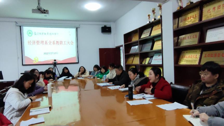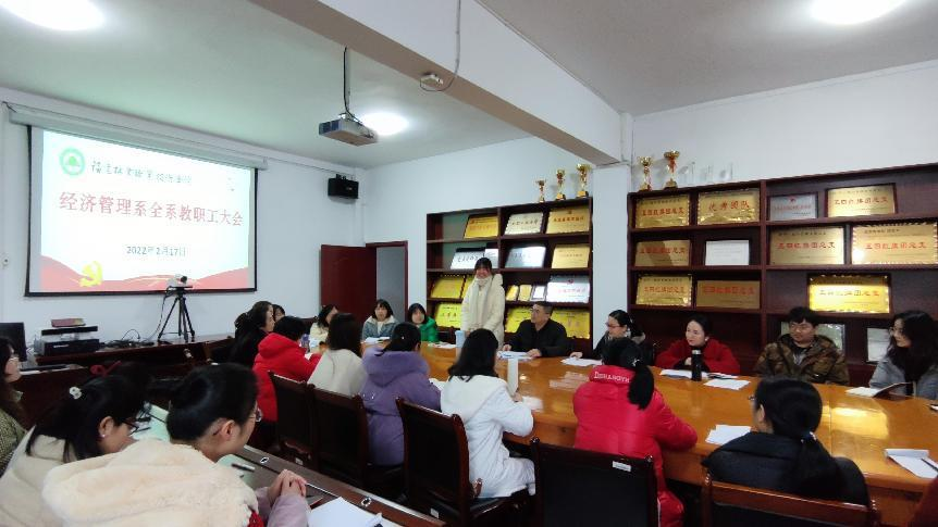 2022年2月17日下午,经济管理系在经管楼408会议室召开了2021-2022学年第二学期全系教职工大会,系主任林文胜主持本次会议。