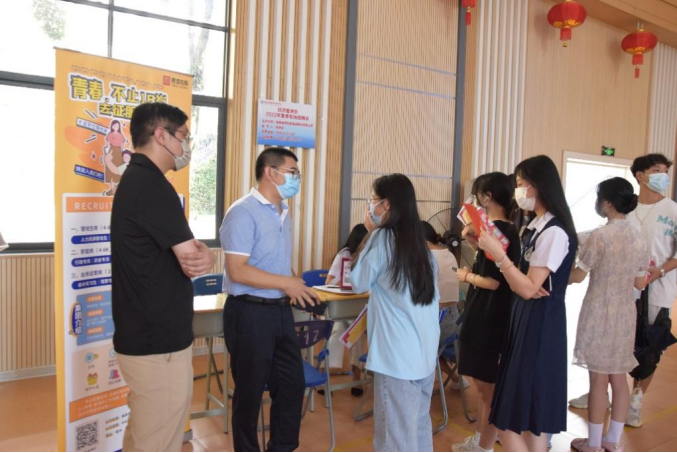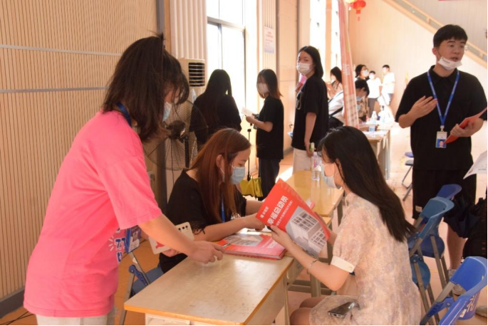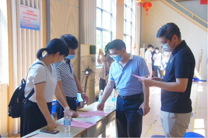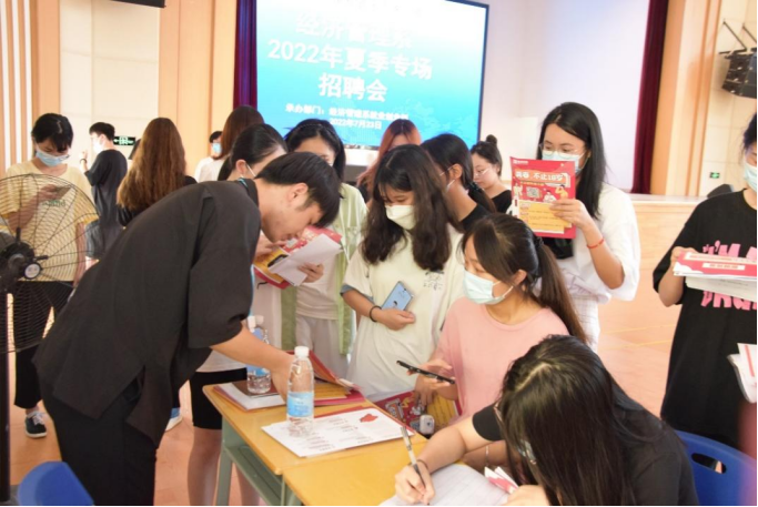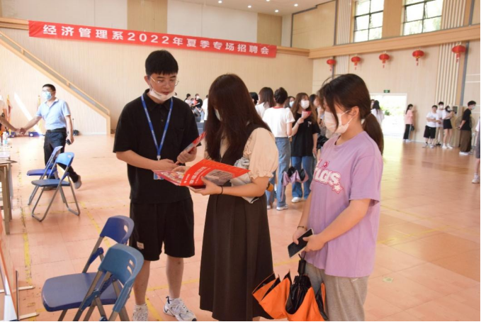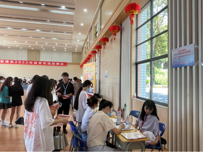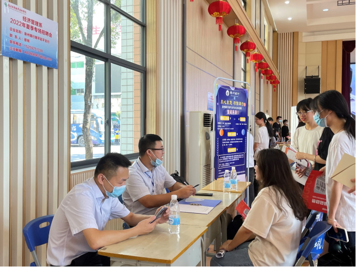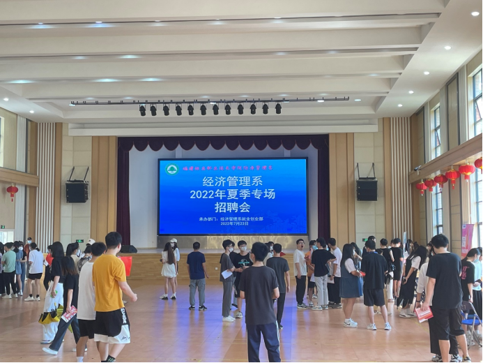 追梦扬帆,人生起航。为全力保障2023届毕业生顶岗实习工作,拓宽学生岗位实习渠道,积极搭建在校毕业生与用人单位精准供需对接平台,2022年7月23日上午,经济管理系夏季专场双选招聘会在天麟礼堂拉开序幕。来自省内的福建君道控股集团股份有限公司、百胜餐饮(福州)有限公司、泉州银行南平延平支行、福建宇邦纺织科技有限公司、福建好房有幸信息技术有限公司、深圳市乐有家房产交易有限公司、南平市森科种苗有限公司等六家企业提供招聘职位100余个,涵盖会计、财务管理、市场营销、电子商务、物流管理等多个专业类别。经济管理系党总支书记谢福荣、党总支副书记王昉以及2023届毕业生辅导员现场巡视,查看毕业生面试情况的同时检查疫情防控工作落实情况。