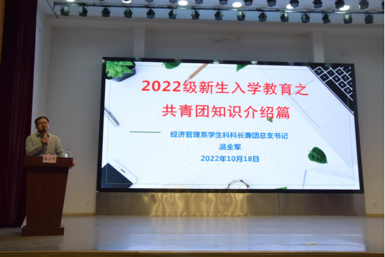 温全军老师为新生介绍经济管理系团总支学生会的组成部分,具体说明了办公室、组织部、宣传部、志愿部、新媒体中心、记者站、秘书处、宿管部、女生部、纪检部、保卫部、易班工作站、文艺部、体育部、社团部、就业创业部、学习部、社会实践部等部门的工作职责和举办活动的内容及时间。