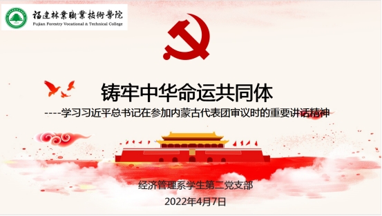 为进一步深化民族团结教育,不断夯实铸牢中华民族共同体意识的思想基础,深入学习习近平总书记学习习近平总书记在参加内蒙古代表团审议的重要讲话精神。经济管理系学生第二党支部于2022年4月7日在经管楼701教室,组织支部入党积极分子开展“铸牢中华命运共同体意识--学习习近平总书记在参加内蒙古代表团审议的重要讲话精神”专题党课。