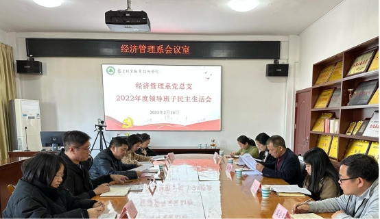 2023年2月16日下午,经济管理系党总支在经管楼408召开2022年度领导班子民主生活会。院长刘文开、组织部部长李霞一行莅临督导,出席本次会议的有经管系党总支书记谢福荣、系党总支副书记王昉、党总支宣传委员陈雨泓、党总支纪检委员黄继红,经管系副科以上干部和各党支部书记列席会议,本次会议由系党总支书记谢福荣主持。