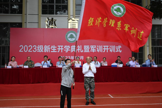 党委书记万泉为天麟校区军训连授旗,党总支书记陈友益老师接旗,向全场挥旗致意。