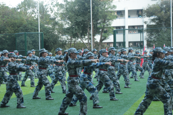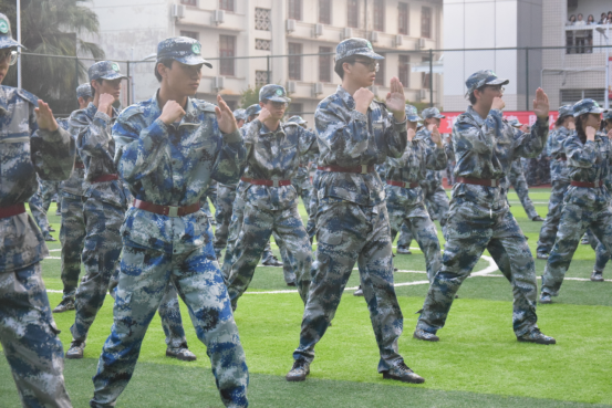 嘹亮的口号,利落的动作,女生们展示出她们巾帼不让须眉的豪情。口号嘹亮,气势震天,教官一声令下,摆好阵势,手紧握拳,一招一式精准有力,踏出了青春的风采,喊出了时代的强!