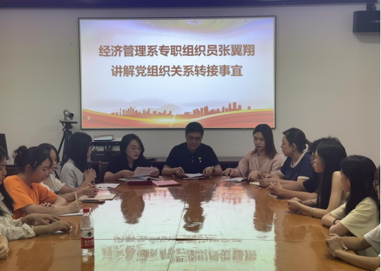 会议的第三项议程,经济管理系党总支专职组织员张翼翔就毕业生党员党组织关系转接、党员e家转出操作、党员档案寄送和接收、介绍信的开具、毕业前党费缴交等为大家作讲解说明。