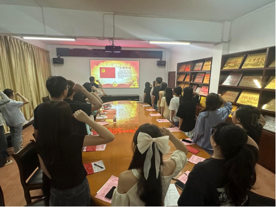 面向鲜红的党旗,经济管理系党总支专职组织员张翼翔带领毕业生党员一起重温了入党誓词。誓词虽短,字字千钧,表达了全体党员永葆初心使命,为共产主义奋斗终身的坚定信念和决心。