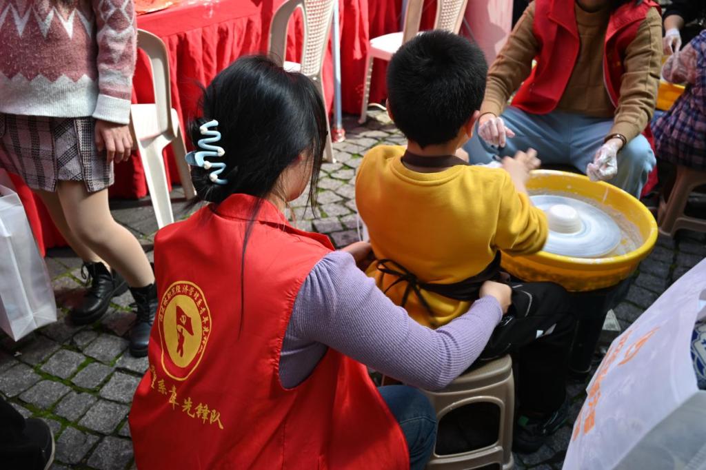 此外,青年先锋队的志愿者们还积极投身进传承非遗技艺活动中,他们不仅认真协助非遗技师们的工作,还为了使市民们有更好地体验非遗技艺,他们在一旁贴心引导市民进行操作,使市民们能够亲身体验与感受传统文化的魅力,增强文化自信。
