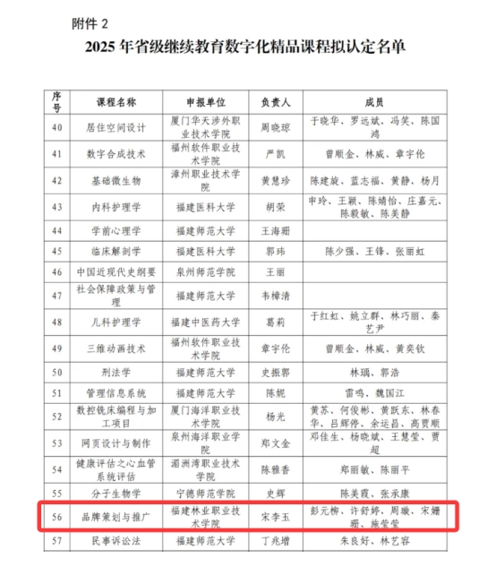 近日,福建省终身教育服务中心公示了2025年省级终身教育重点建设项目拟立项名单。根据《福建省终身教育促进委员会关于开展福建省终身教育提质培优项目建设工作(2022-2025年)的通知》及《福建省教育厅关于开展2025年省级职业教育与终身教育重点建设项目申报工作的通知》要求,经个人申报、学院推荐、专家评审,我系宋李玉老师负责的《品牌策划与推广》课程立项为省级继续教育数字化精品课程。