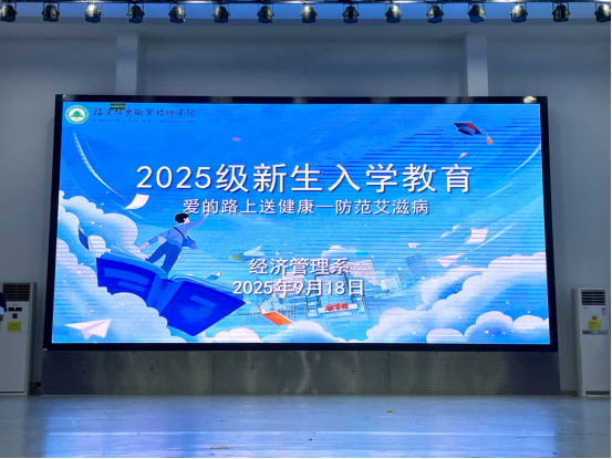 2025年9月18日晚,经济管理系在天麟礼堂开展了一场关于“爱的路上送健康--防范艾滋病”的公益性讲座。本场讲座由李丹老师主讲、罗颖老师主持,经济管理系2025级全体新生参与。