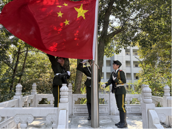 伴随着激昂雄壮的《义勇军进行曲》,五星红旗冉冉升起,迎风飘扬。全体师生肃立行注目礼,嘹亮的国歌回荡在田径场上空,2025级新生开学典礼暨军训开训式正式拉开序幕。