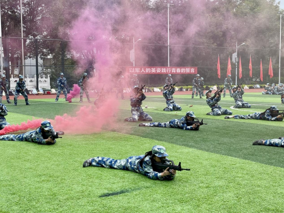 刺杀方阵持枪姿势挺拔,突刺动作连贯迅猛,喊杀声震彻田径场,尽显少年锐气与热血担当。