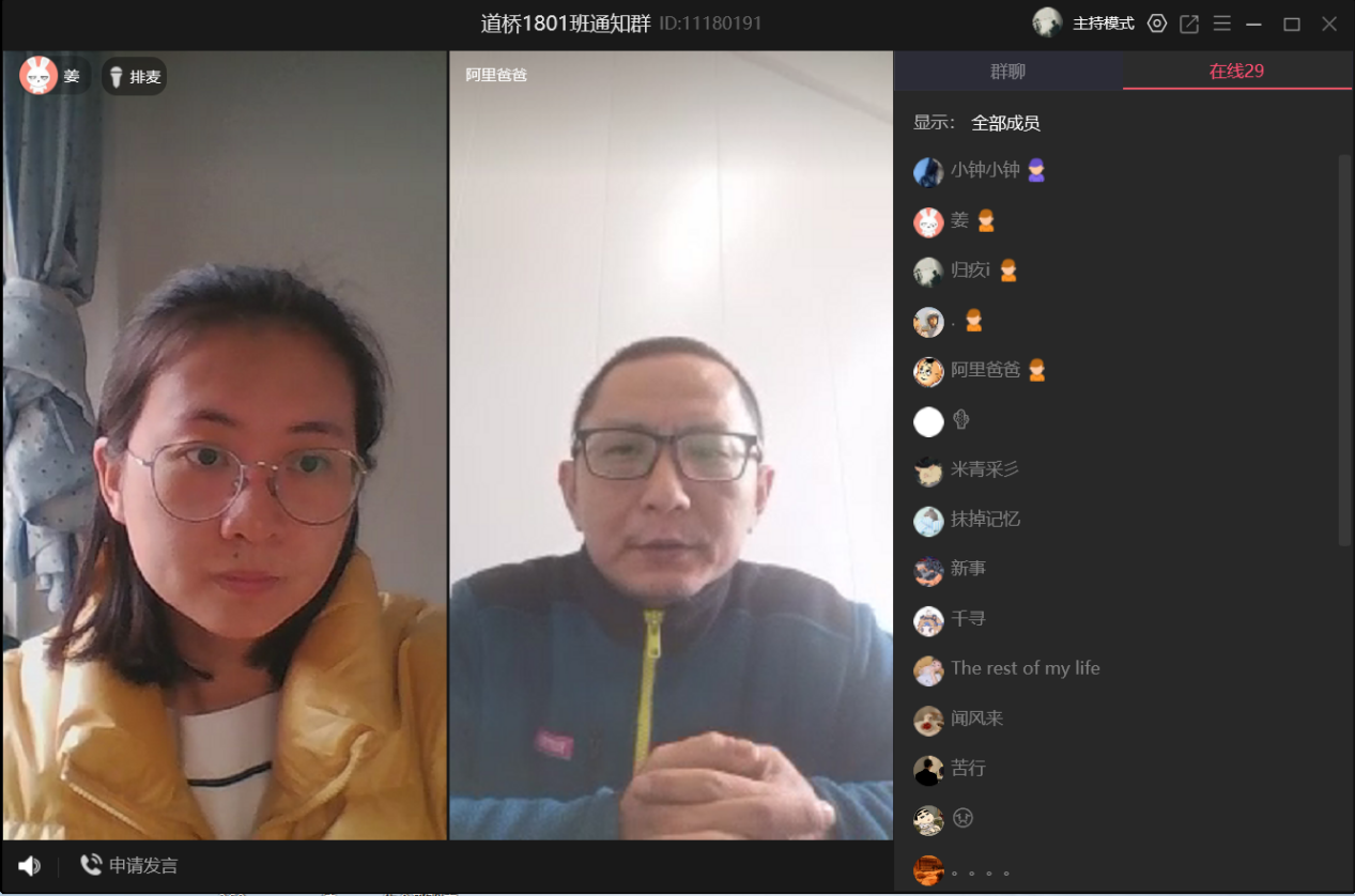 为深入贯彻落实习近平总书记关于打赢疫情防控阻击战的重要指示批示精神,积极响应福建省委教育工委、省教育厅和院党政有关疫情防控工作部署,进一步做好我院疫情防控工作,按照《福建林业职业技术学院关于疫情期间组织开展网络主题班会活动的通知》要求,2020年3月10日上午,我系孙华主任为道路桥梁工程技术1801班召开以“疫情就是命令、防控就是责任”为主题的线上网络班会,本次班会由辅导员姜晓娟主持、道路桥梁工程技术1801班全体同学参加,孙华主任作重要讲话。