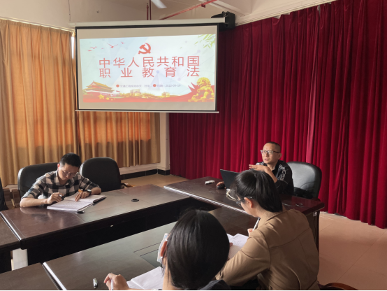 2022年4月20日,第十三届全国人民代表大会常务委员会第三十四次会议通过《中华人民共和国职业教育法》修订,自2022年5月1日起施行。为加强我系教师对新修订的《中华人民共和国职业教育法》的认识和学习,5月20日下午,交通工程系在实训一六楼会议室召开专题会议,组织全系教师学习新修订的《中华人民共和国职业教育法》,孙华主任主持学习。