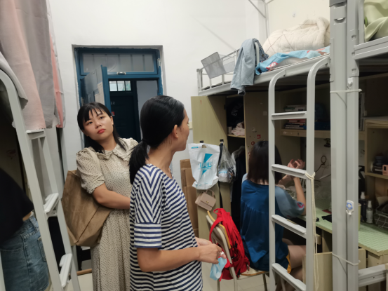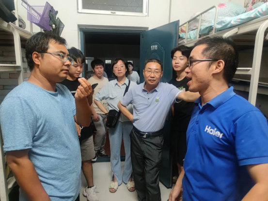 走访期间,李肇锋书记和孙华主任与学生进行亲切的交谈,详细了解学生的情况,鼓励同学们放心在校、努力学习,有困难及时向老师们反应。殷切叮嘱新生整理好自己的个人内务,融洽处理寝室关系,鼓励新生要与高中一样在大学继续努力,以乐观的态度和饱满的精神状态投入到新学期的学习和生活中。在疫情防控常态化性形势下,要求同学们及时开窗通风,搞好宿舍内的卫生,按时做好“日报告、零报告”等工作。