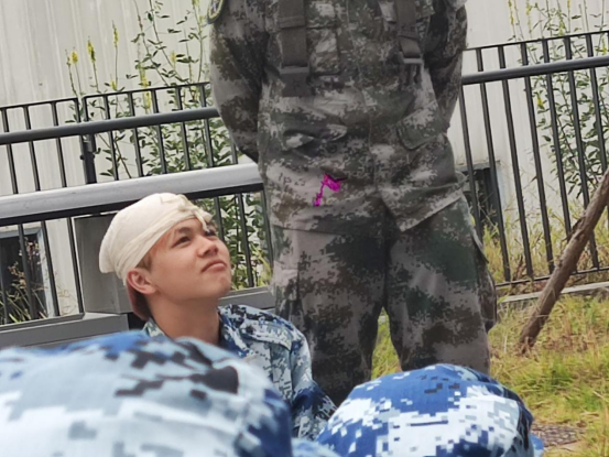 教官姓俞,长得很像吴京,我们都叫他“京哥”刚开始就命令我们站军姿10分钟,顶的烈日,并且腰要挺直,两手紧贴大腿两侧,两只脚分开60度,10分钟后同学们一个个汗流浃背,好在“京哥”十分民主人性化,让我们坐下来休息了。