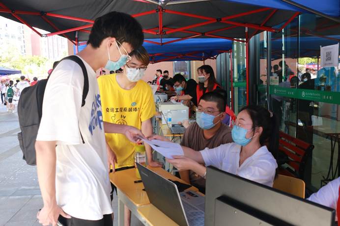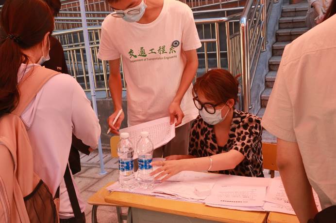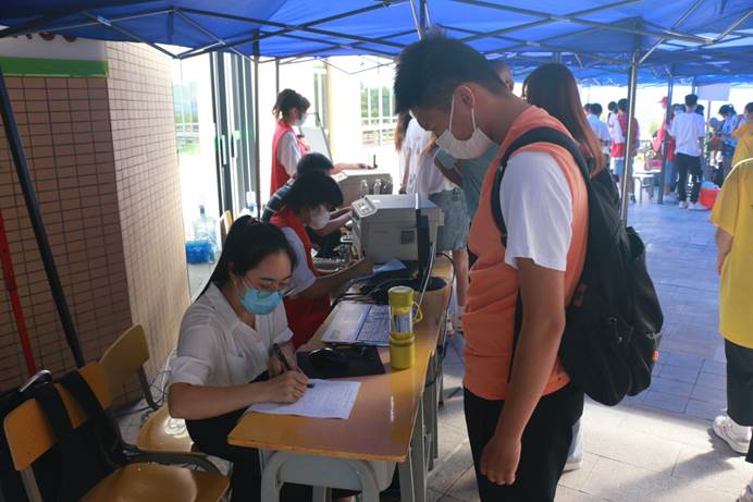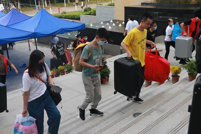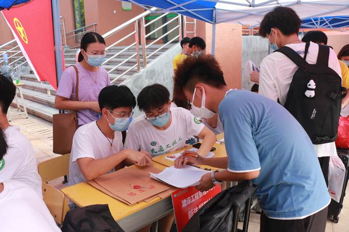 在学院门口接待点,我系党员教师和学生认真查看到校同学的健健康码,核实48小时核酸检测阴性证明和疫苗注射情况,对健康码异常和没有核酸检测证明的同学,立即通知校医务室进行相关处理。我系志愿者同学帮助到校同学搬运行李并引导到注册点进行注册。