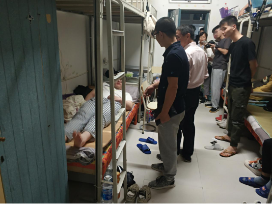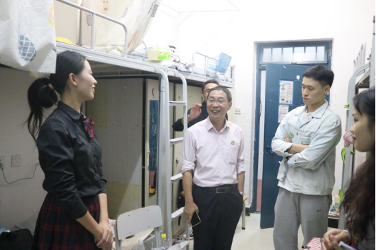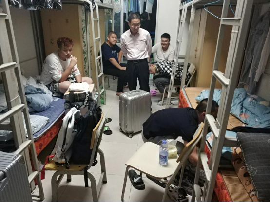 在走访的过程中,各位领导和老师细心地询问同学们的入住情况,谢金生副院长就是否适应大学生活、学校迎新和其他工作等问题同新同学亲切交谈,并为同学们解答了关于宿舍的疑问,强调困难是暂时的,学校的7号学生公寓已经快要封顶,8号学生公寓也已经在建,等新宿舍楼建成,同学们的住宿环境一定会得到很大改善;李肇锋书记在走访的过程中告诉新同学们,宿舍是大学生活的重要场所,天南海北的10个人相聚一个宿舍是很大的缘分,大家要珍惜大学同学之间的友谊,好好学习,针对有位同学因为个子高床不够的情况,李书记亲自帮助挪柜子,在床尾为该同学腾出位置,以方便入住;孙华主任提醒新同学们要注意用电安全,预防电信诈骗,要求同学们要走出宿舍,多去运动场进行体育锻炼,提高自身身体素质,针对部分同学反映的床下放不进去行李箱的问题,孙主任亲自示范,帮助同学们收拾并安放行李。