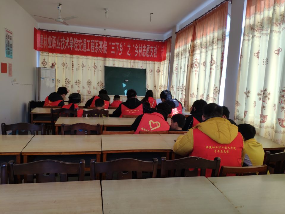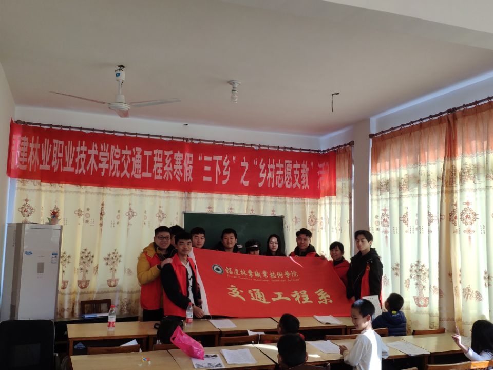 为深入学习贯彻习近平新时代中国特色社会主义思想,组织引导广大青年学生在深入社会、了解国情、接受锻炼的过程中培育和践行社会主义核心价值观,落实《共青团福建林业职业技术委员会关于开展2020年寒假社会实践活动的通知》闽林院团 ([2020]1号)的文件精神,2020年1月14日,交通工程系“寒假三下乡之乡村支教”活动正式拉开序幕,我系学生科长兼团委书记陈静老师带领支教志愿者前往于夏道镇安济村开展义务支教活动。