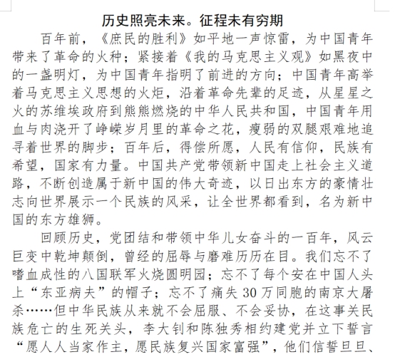 参加比赛的同学们认真构思写作,通过笔下的文字书写了对百年党史的感想,抒发对党的敬佩与感激,表达了“永远跟党走、奋进新征程”的决心,书写了中国青年们在新文化运动时期,积极探索救国道路;在中华人民共和国成立后,积极参与国民经济恢复的各项工作,主动支援抗美援朝,争当建设社会主义的积极分子;在党的十一届三中全会后,积极投身建设中国特色社会主义伟大实践的青春故事。