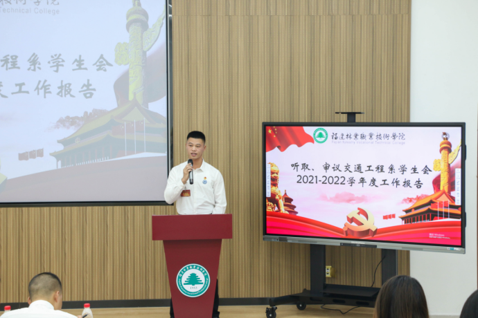 议程一是听取、审议《共青团福建林业职业技术学院交通工程系总支部委员会2021-2022学年年度工作报告》及《福建林业职业技术学院交通工程系学生会2021-2022学年年度工作报告》,梁宇暄同学代表系团总支作过去一年的工作报告,陈志超同学代表学生会作过去一年的工作报告。