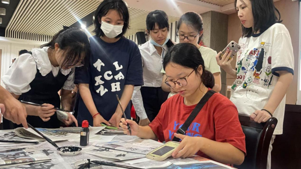 首先,博物馆的工作人员讲解了朱子生平及在闽北时的事迹,介绍了朱熹的理学思想与他所创办的书院,引导志愿者们探寻雕版印刷的起源,了解雕版印刷术对文明发展的推动作用,体会“建本”文化的深厚底蕴。最后,志愿者们体验了雕版印刷的流程,感受了雕版印刷术的精妙与背后的巧思,练习了毛笔字的书写,一笔一划皆是传承,在宣纸上留下了属于他们自己的“墨宝”。