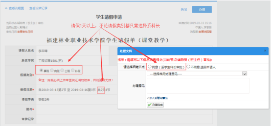 5.1若学生请假类别为:事假,病假且在3天内包含3天,直接点击办理完成,完成办理。