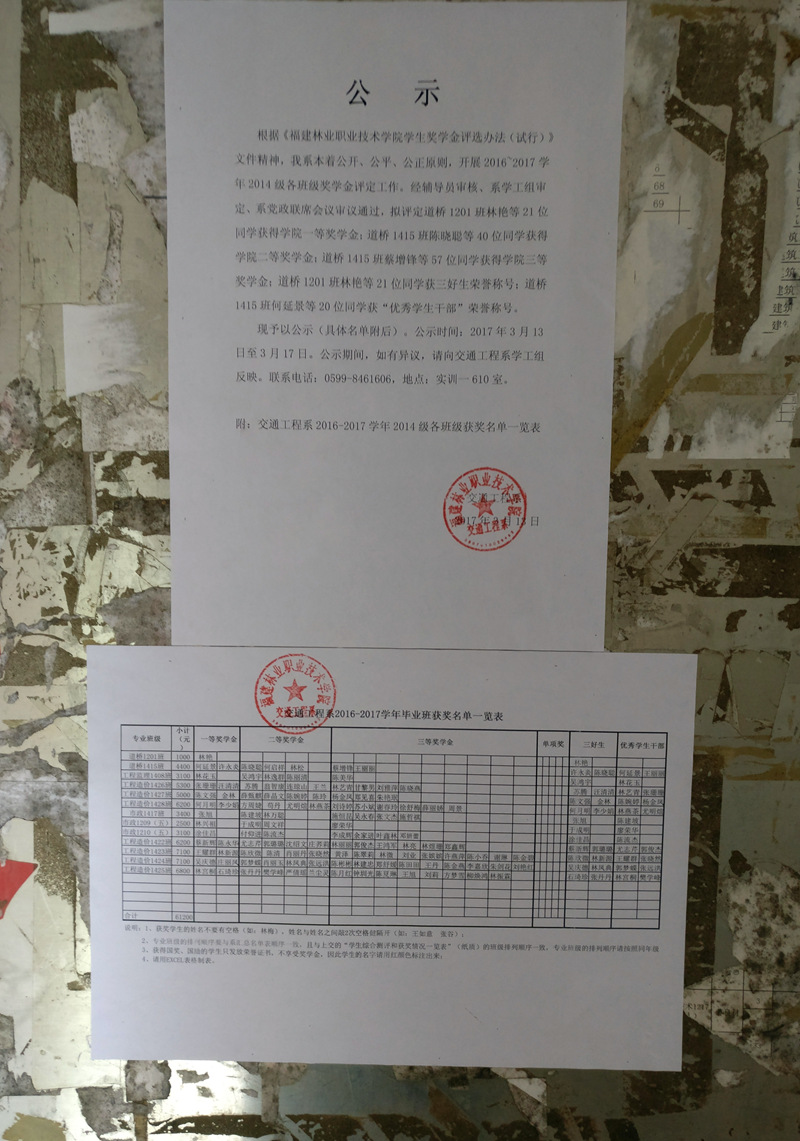 根据《福建林业职业技术学院学生奖学金评选办法(试行)》文件精神,我系本着公开、公平、公正原则,开展2016~2017学年2014级各班级奖学金评定工作。经辅导员审核、系学工组审定、系党政联席会议审议通过,拟评定道桥1201班林艳等21位同学获得学院一等奖学金;道桥1415班陈晓聪等40位同学获得学院二等奖学金;道桥1415班蔡增锋等57位同学获得学院三等奖学金;道桥1201班林艳等21位同学获三好生荣誉称号;道桥1415班何延景等20位同学获“优秀学生干部”荣誉称号。