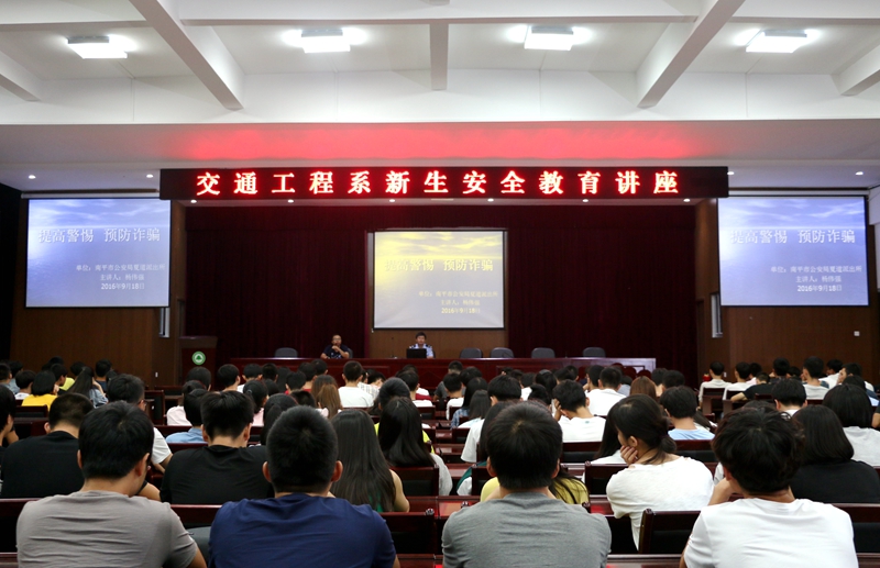 2016年9月18日晚7:30,交通工程系新生入学教育之新生安全教育讲座在江南校区礼堂举行。南平市公安局夏道派出所的杨伟强警官为新生做了题为《提高警惕,预防诈骗》的讲座,讲座由系党总支副书记徐洪主持。