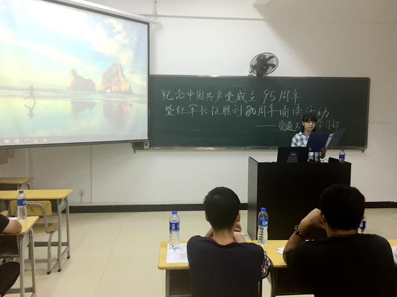 2016年10月25日晚7点,由交通工程系学习部举办的“庆祝中国共产党成立95周年暨红军长征胜利80周年”诵读比赛在实训四405圆满举行。 为传承和弘扬爱国主义为核心的伟大民族精神,庆祝中国共产党成立95周年暨红军长征胜利80周年,以及更好激发师生“铭记历史、缅怀先烈、珍视和平、开创未来”的强烈愿望,特举行此次比赛。 本次比赛得到广大同学的积极响应,众多大一、大二同学们参与本次比赛。交通工程系辅导员姜晓娟老师、彭锦水老师出席本次比赛并参与评委工作。比赛开始,参赛选手精神饱满,声情并茂的诵读了《长征》、《沁园春•雪》等经典诗句文章。加以配乐等形式,深情款款、抑扬顿挫地表达对祖国的热爱,对长征路上英烈的缅怀。为在场的师生献上一场精彩纷呈,有声有色的诗文诵读盛宴。最后,经过评委的评比之下,由造价1533班的杨思语同学获得本次大赛的一等奖。 希望借此比赛让交通工程系的学子们能够坚定信仰,树立远大的理想,奏响青春正能量,争当中国好青年!