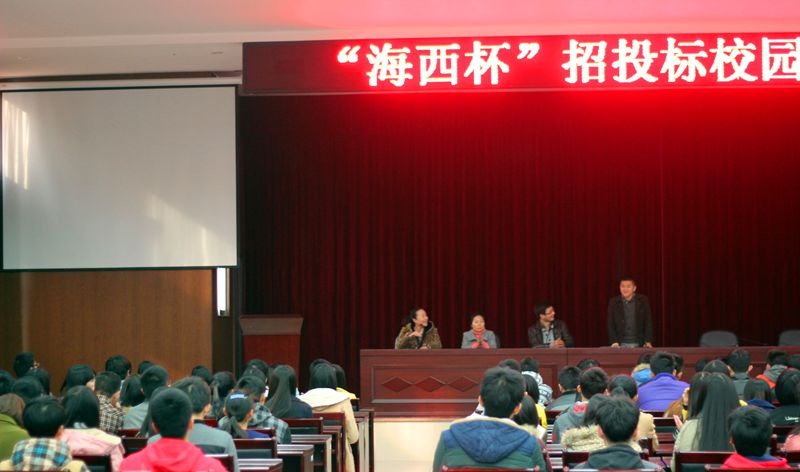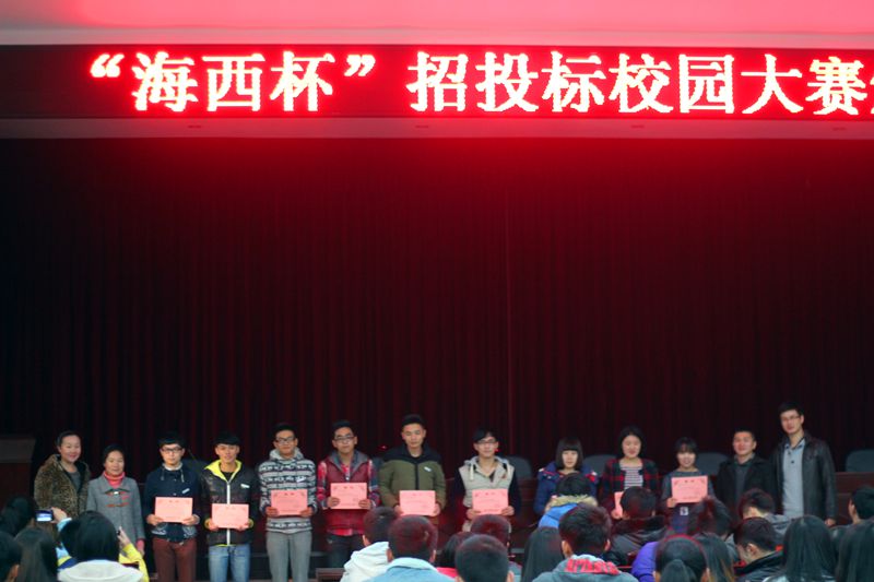 2014年12月12日下午3点,2014年全省高校“海西杯”招投标比赛校园选拔赛的颁奖仪式在福建林业职业技术学院江南校区礼堂如期进行。我院工程造价专业的同学踊跃报名参加本次大赛,经过筛选,选拔赛共组织了10支队伍参加,每队由3名学生组成。经过20天的比赛,最终由造价1210班康婷婷、造价1211班孙斌、造价1213班林森组成的队伍获得了本次校园选拔赛的一等奖,其余9支队伍获得优秀奖。