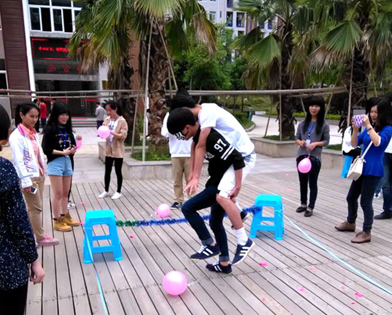 此次活动以班级为单位,每班派出四名学生组成团队参加。活动设有二个环节,分别为“闯关寻宝”和“撕名牌”。其中“闯关寻宝”设三个小游戏:转身运气球、瞎子背瘸子、四人五足。这些小游戏既考验了团队之间的默契程度,又锻炼了大家的团队合作能力。最后根据每个团队在三个游戏使用的时间长短,道桥1415班、造价1422班、造价1424班以最短的时间进入“撕名牌”环节。