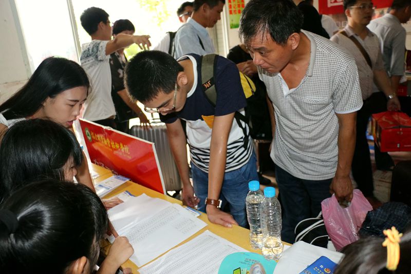 临近中午,天空下起了沥沥细雨,迎新的各项工作仍在有序进行,并没有因天气受到影响,志愿者们仍在紧张地忙碌着。