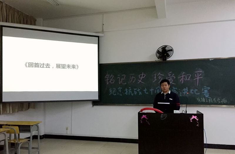 为纪念中国人民抗日战争暨世界反法西斯战争胜利70周年,激发大学生群体的爱国热情。11月24日晚7:30,交通工程系“铭记历史,珍爱和平”纪念抗战胜利70周年演讲比赛在江南校区顺利举行。 本次比赛经过个人报名和班级推选等方式进行初赛海选,共有10名选手进入决赛。经过紧张激烈的角逐,共产生一等奖1名,二等奖2名,三等奖3名。 当晚,交通工程系胡征莹、陈毅勇、卢笑芳、陆晓莉等老师到场担任评委。比赛结束后,陈毅勇老师就演讲内容、选手表现和演讲技巧等方面进行了点评,并希望同学们积极参加各类活动,总结经验,更进一步。 此次比赛,同学们深刻缅怀了抗战英雄的光辉业绩,弘扬了爱国主义精神和民族精神,增强了青年学生的社会责任感和使命感。同学们纷纷表示要刻苦学习,发扬艰苦奋斗精神,早日实现中华民族的伟大复兴。