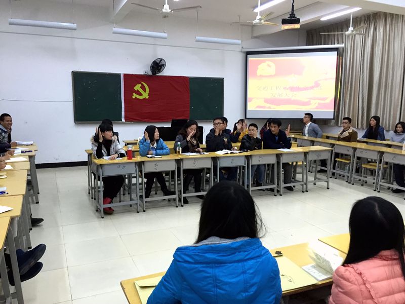 2015年12月15日晚7点30分,交通工程系学生党支部预备党员发展大会在实训四410举行。我系学生党支部15名正式党员、20名预备党员及27位发展对象参加会议,会议由系党总支副书记徐洪同志主持。 首先,徐洪同志对于此次会议做了简要介绍,会议按照党员发展程序有条不紊的进行:即每位发展对象逐宣读《入党志愿书》、入党介绍人介绍情况,民主评议,正式党员表决,宣读决议,入党宣誓、新党员表决心;27名发展对象向党组织做了思想汇报,他们以诚挚的言语向党阐述了自己的思想变化,表明了自己加入共产党的决心;最终均以全票通过,成功加入中国共产党。最后,徐洪同志对于此次会议进行了总结,他指出:全体党员要严格要求自己,不断加强党性修养,自觉宣传党的政策,树立党的威信,维护党的形象;模范遵守学校和党组织的各项制度,为同学服务,加强自我要求,充分发挥党员的主观能动性和先锋模范作用,做全系同学的好榜样。 此次发展大会,为我系学生党支部注入了新鲜的血液,增加了党员数量,提升了党员质量。新党员也将以他们良好的精神风貌,切实发挥党员的先锋模范作用。