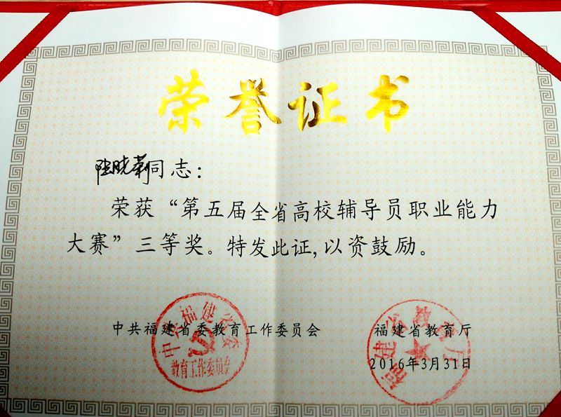 近日由中共福建省委教育工委、福建省教育厅主办,教育部高校辅导员培训和研修基地(福建师范大学)、福建省高校辅导员专业委员会承办的第五届福建省高校辅导员职业能力大赛在福建师范大学落下帷幕。经过学生处宣传、推荐,我系辅导员陆晓莉代表学院参加了本次比赛,荣获大赛三等奖。